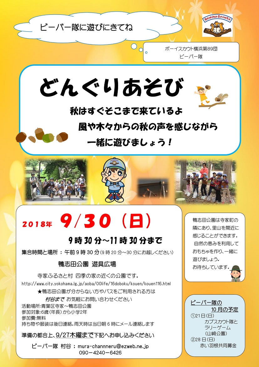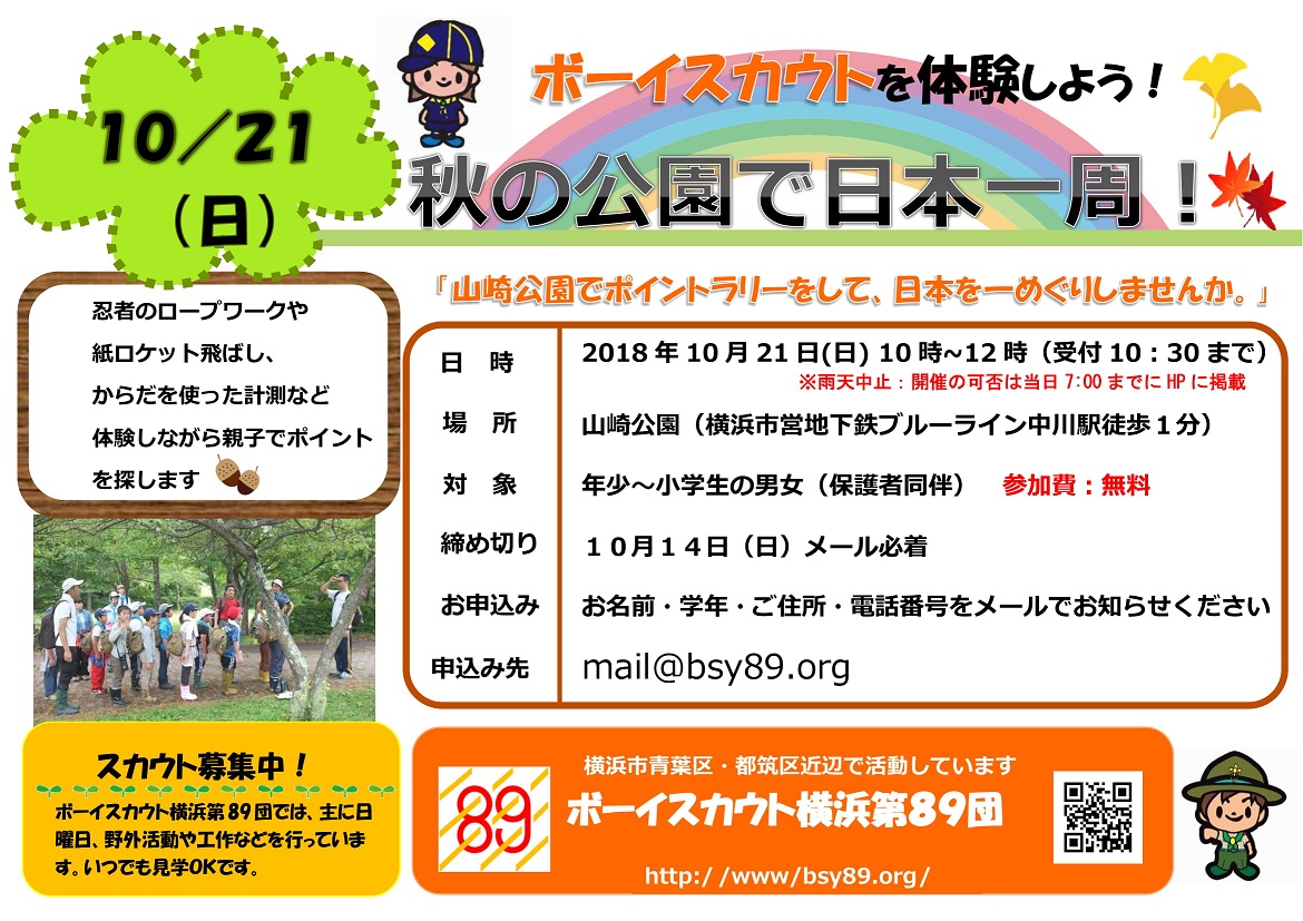 | 9 | 2018.9.15 | 秋の公園で日本一周体験募集(2018.10.21)チラシ掲載 | ビーバー隊・カブ隊 |