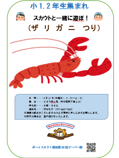 | 2 | 2018.6.15 | ザリガニつり(2018.6.17)参加者募集 | ビーバー隊 |