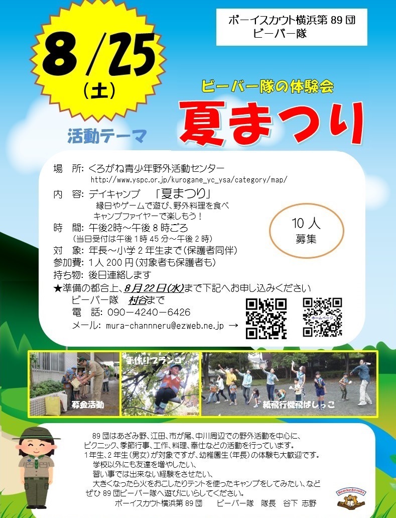 | 7 | 2018.8.9 | デイキャンプ夏祭り・体験募集(2018.8.25)のチラシ掲載 | ビーバー隊 |