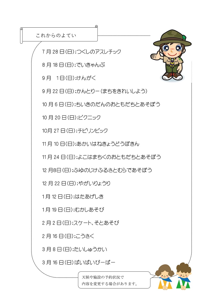| 15 | 2019.9.11 | チビリンピック(2019.10.27)チラシ掲載 | ビーバー隊、カブ隊 |