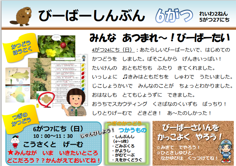 | 5 | 2018 .6.24 | ビーバーだより(2018.6.17号)掲載しました。 | ビーバー隊 |
